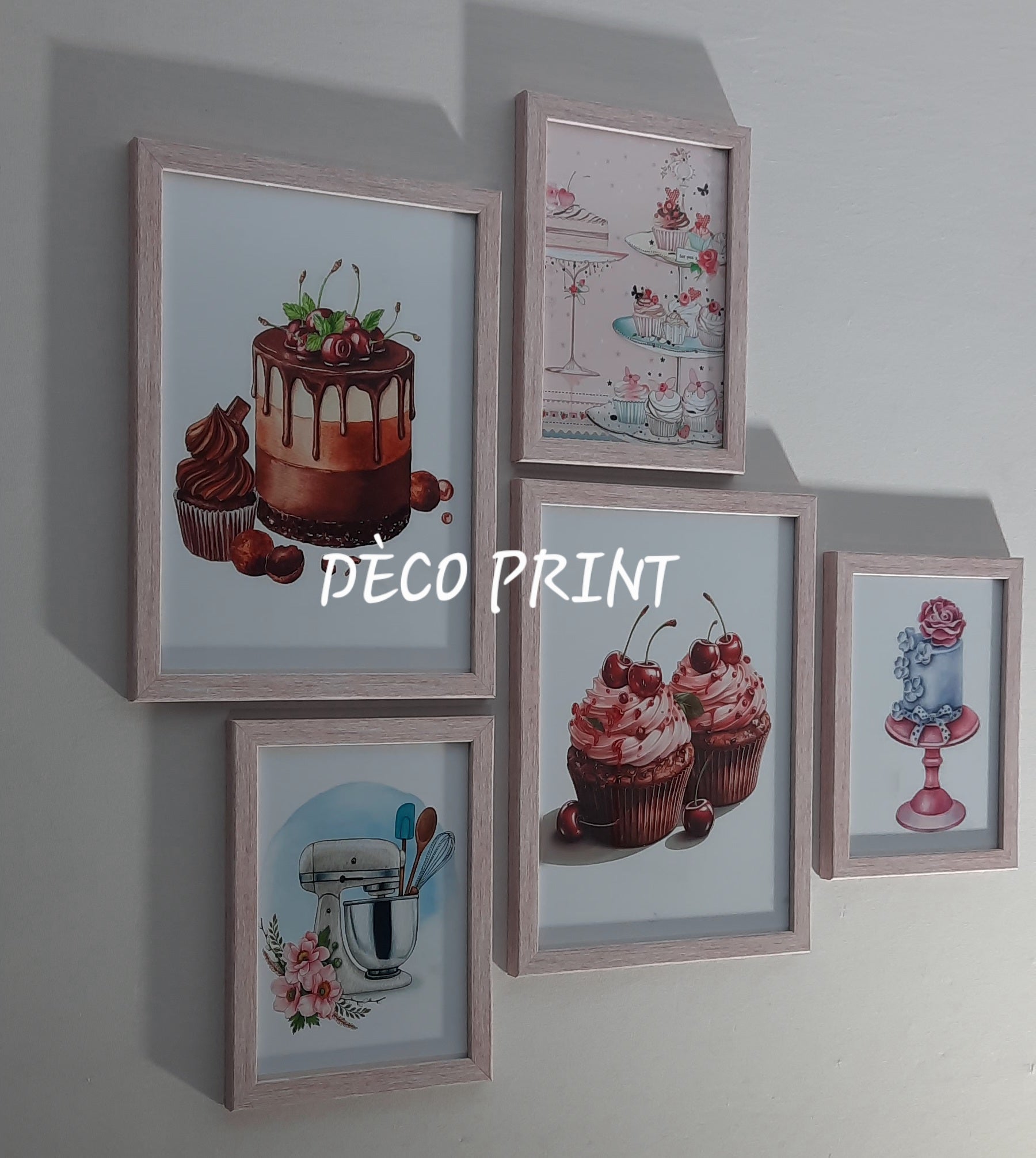 شكيلة فنية لمجموعة لوحات جدارية متكونة من 05 إطارات ذات جودة عالية خاصة بمحل بيع حلويات و باتيسري