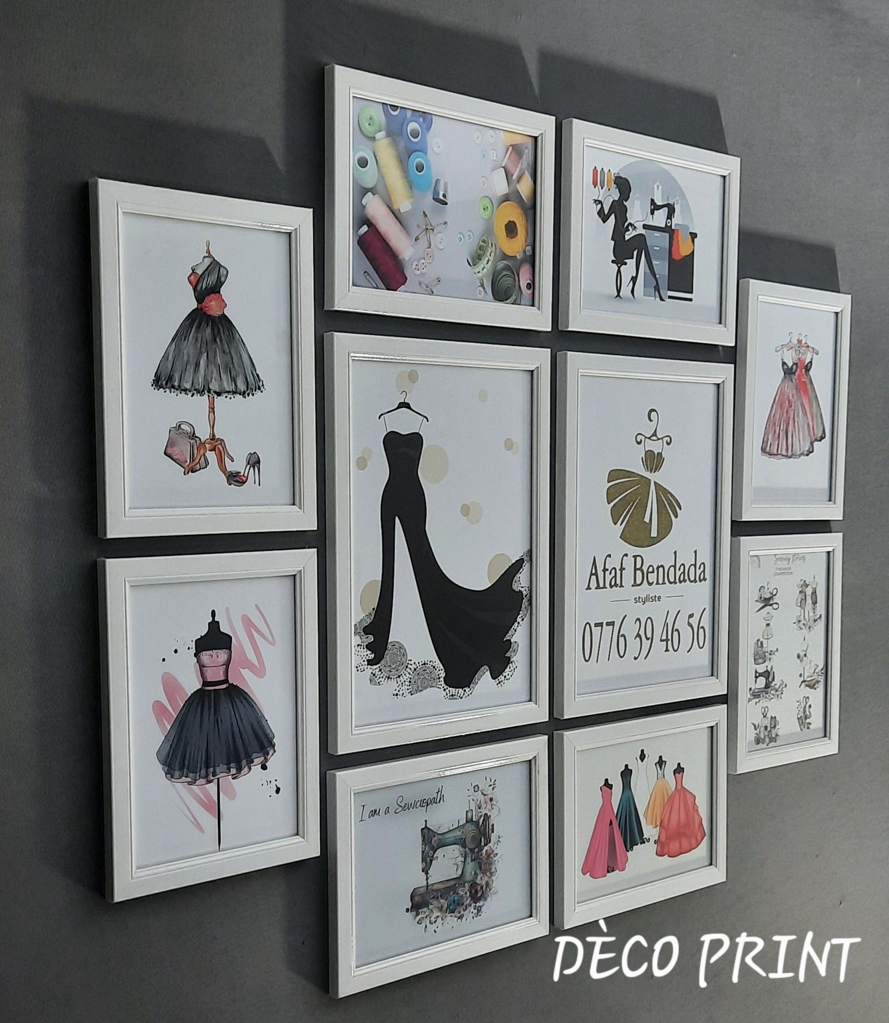 شكيلة فنية لمجموعة لوحات جدارية متكونة من 10 إطارات ذات جودة عالية خاصة بمحل خياطة