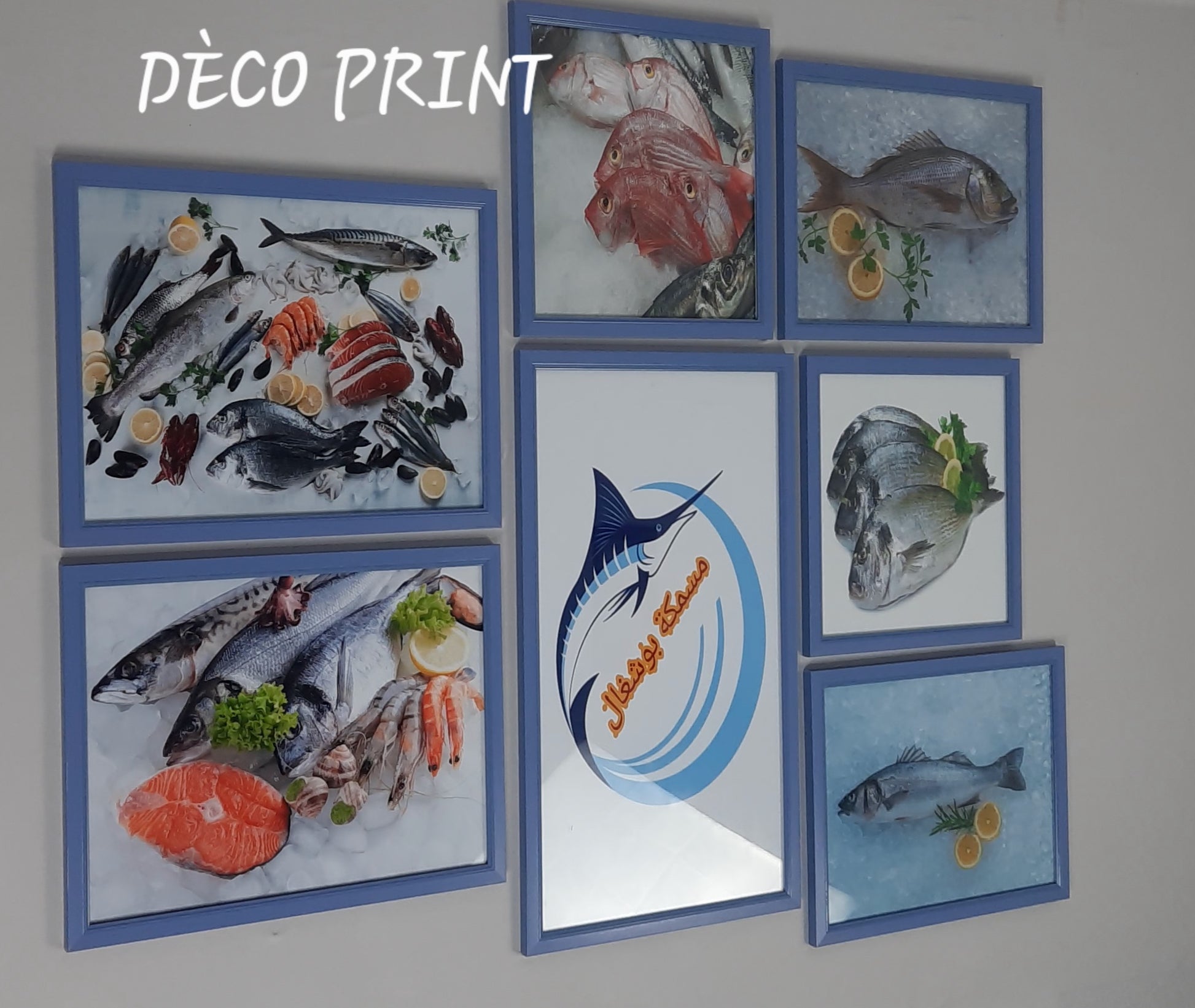 شكيلة فنية لمجموعة لوحات جدارية متكونة من 07 إطارات  ذات جودة عالية خاصة بمحل بيع السمك